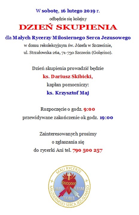 W dniu 20 października 2018r. odbędzie się kolejny IV Dzień Skupienia dla Małych Rycerzy Miłosiernego Serca Jezusowego w dom rekolekcyjnym św. Józefa w Szczecinie, ul. Strzałowska 26a, 71-730 Szczecin (Golęcino).