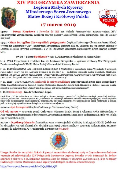 Uwaga: Organizator zastrzega sobie prawo do zmian w programie XV Pielgrzymki Zawierzenia… Prośba do wszystkich Małych Rycerzy i uczestników duchowej uczty w Częstochowie o duchowe wsparcie tak rekolekcji jak i XV Pielgrzymki Zawierzenia Legionu. Ponadto w tych intencjach ks. Lesław odprawił 2 Msze św. Transmisja stała z kaplicy jest dostępna na stronie internetowej np: