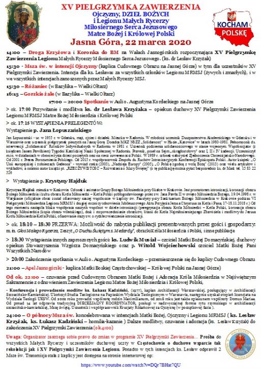 Niech będzie chwała i cześć i uwielbienie dla Matki Bożej Królowej Polski, która przyjęła i otoczyła opieką i miłością wszystkie swe dzieci w tym czasie rekolekcji i XIV Pielgrzymki Zawierzenia w trwającym roku Ducha Świętego a także roku św. Józefa (współpatrona Legionu MRMSJ) oraz w trwającej100 rocznicy odzyskania Niepodległości Polski.