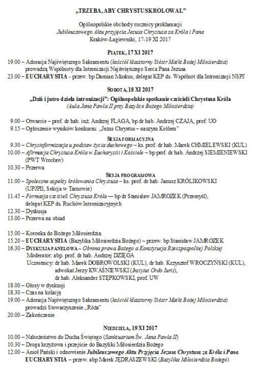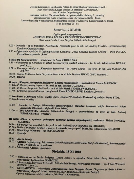 Odnowienie Jubileuszowgo Aktu przyjęcia Jezusa Chrystusa za Króla i Pana wg programu jaki otrzymaliśmy 3 listopada 2017 r. Program - plik PDF do pobrania