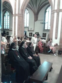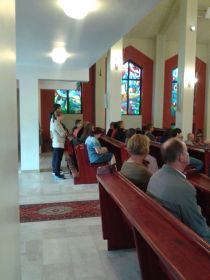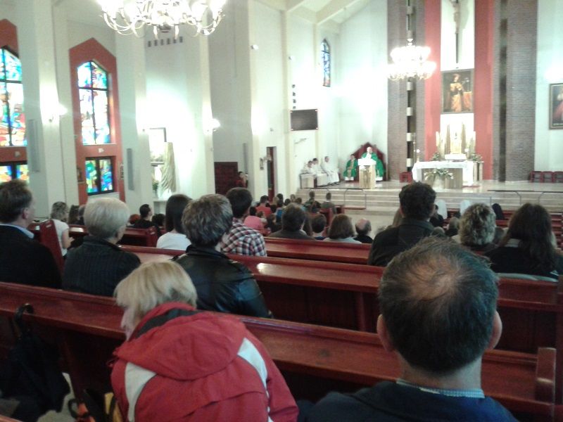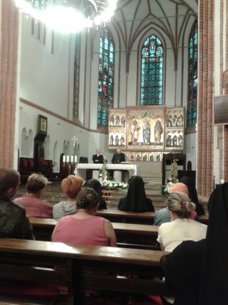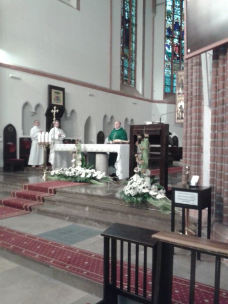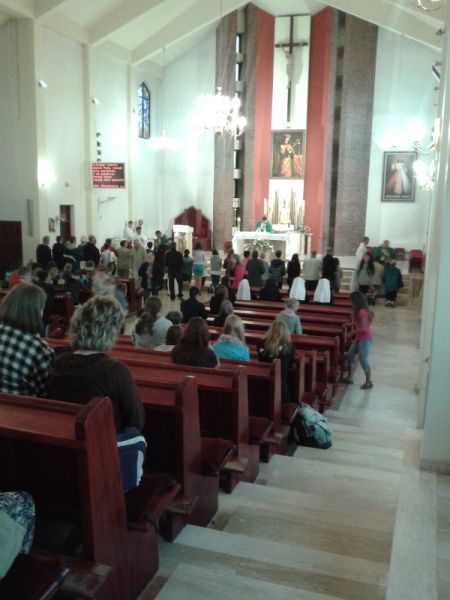 Mszę św. koszalińskiej Katedrze celebrował ks. Łukasz Gąsiorowski Diecezjalny Duszpasterz Rodzin. Ks. Łukasz po raz siódmy jest kierownikiem XV PP Koszalin – Myślibórz. Pielgrzymka ta to 225 km w dziewięć dni – tyle ile trwa nowenna do Bożego Miłosierdzia. Ks. Łukasz korzystając z Dzienniczka św. Faustyny otwierając natrafił na słowa Pana Jezusa: „Głoś Miłosierdzie”, więc temat ten będzie bardzo mocno akcentowany w tej jubileuszowej pieszej pielgrzymce.
